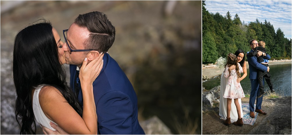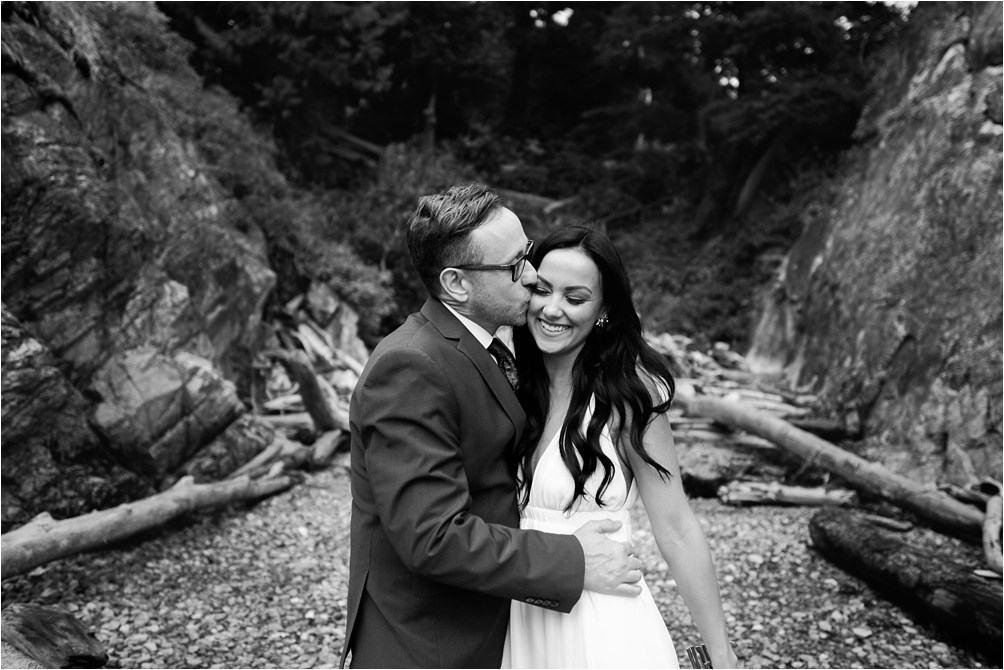 As far as venue decor was concerned, the couple was content to let Mother Nature do most of the work. The only extra effort required was a small trek, which brought bride, groom, and the other attendees to the sweet little coastal cove of Whytecliff Park. One of Canada’s first protected marine areas, Whytecliff is bustling with more than 200 marine animal species, including the photogenic sea lions that can often be seen sunning themselves on the beach. Though full of life, the gently rippling water offered a deep sense of serenity, while the rocky outcroppings added a playful element as the perfect place to climb, and jump, and scramble. Soaring skies and towering trees imbued the scene with tranquil strength. Overall a beautifully fitting place to exchange vows despite, or perhaps because of, its lack of traditional (read man-made) opulence. Each element of the venue is a textured example of important pillars in any successful marriage.